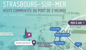 Le circuit au départ de l’embarquement Dauphine (Rivétoile) permettra de retracer l’histoire de la ville portuaire, de découvrir les entreprises qui chaque jour emploient 10 000 salariés et découvrir les infrastructures (bassins, écluses, pont tournant ferroviaire, portiques). Les participants navigueront directement sur le Rhin, passant sous les différents ponts qui unissent la France et l’Allemagne, dont la passerelle Mimram. La visite commentée offrira un moment d’échange convivial entre le guide et le public.